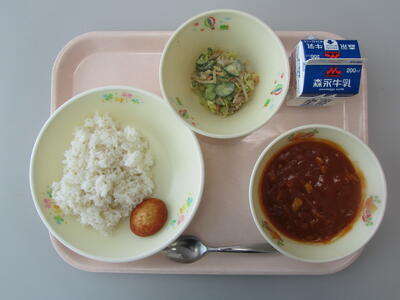 「お豆のハヤシシチュー」「チキンナゲット」「ごぼうサラダ」「麦ごはん」でした。