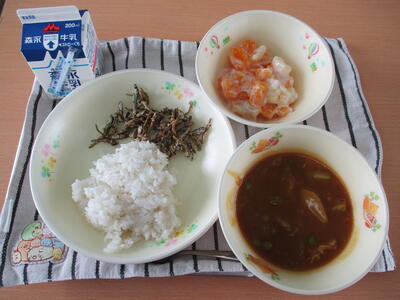 「春野菜のカレー」「いりこの酢炊き」「ヨーグルト和え」「麦ごはん」でした。