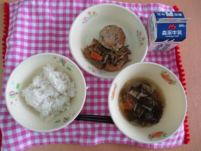 「もずくのすまし汁」「彩り野菜の豆腐よせ」「五目きんぴら」「麦ごはん」でした。