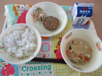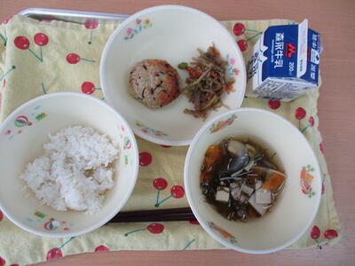 「かきたま汁」「いわしのハンバーグ」「野菜のじゃこ和え」「麦ごはん」でした。