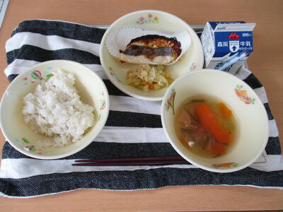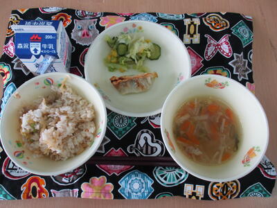 「まごわやさしい」食材がそろった献立でした。おさらいしましょう。「まめ、ごま、わかめ、やさい、さかな、しいたけ、いも」ですね。いくつ見つけられたかな。