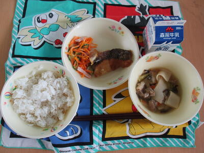 今日は、米粉を使ったパンが登場しました。小麦粉のパンよりもちもち感があります。キャラメル味の大豆は、カリカリと噛み応えがありました。いろいろな食感を楽しめる献立でした。
