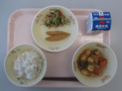 「じゃがいものカレーうま煮」「きびなごカリカリあげ」「海藻の酢の物」「麦ごはん」でした。