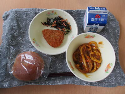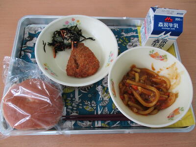 「カレーうどん」「かぼちゃフライ」「ひじきサラダ」「米粉パン」でした。