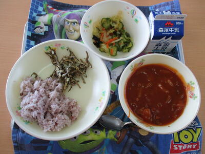 トマトがたっぷり入ったハヤシシチュー。ほんのり甘酸っぱい味が、まだ暑いこの時期には食欲をそそります。カルシウムたっぷりのいりこを、よくカムカムして食べました。