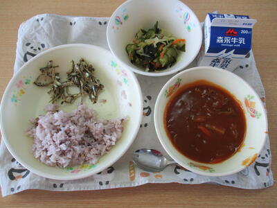 「ハヤシシチュー」「キャベツとわかめのサラダ」「カムカムいりこ」「雑穀ごはん」でした。