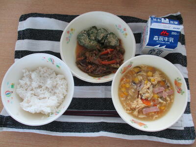 「マーボー豆腐」「にんじんシュウマイ」「中華風コーンサラダ」「麦ごはん」でした。