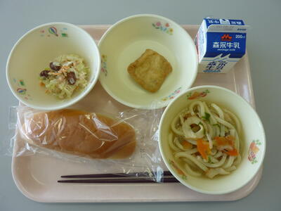「五目うどん」「肉信田」「ビーンズサラダ」「ミルクパン」でした。