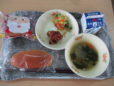 「コンソメスープ」「鶏のからあげ」「もみのきサラダ」「ミルクパン」「セレクトケーキ」でした。