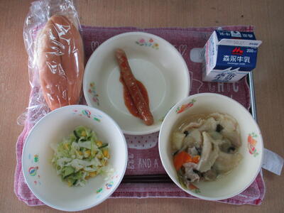 「白菜のクリーム煮」「ポークケチャップ」「からいもサラダ」「食パン」でした。