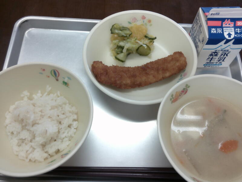今日のメニューは、麦ご飯、かしわ汁、たちうおフライ、あまなつサラダ、牛乳でした。芦北・水俣地域の特産品、太刀魚やあまなつが使われたメニューです。かしわ汁の鶏肉も柔らかくておいしかったです。