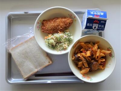 今日のメニューは、食パン、コーンポタージュ、ホキのカレー南蛮、コールスローサラダです。暑さに食欲も落ちてくる季節です。今日は白身魚にカレー味をつけてあり、食欲がわいてきます。