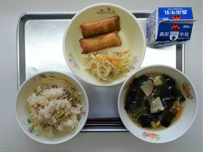 今日のメニューは、焼き肉チャーハン、わかめスープ、春巻き、中華サラダの中華メニューです。焼き肉チャーハンに入っている豚肉には、疲労回復によいとされるビタミンB1が多く含まれています。しっかり食べて、夏を乗りきろう。