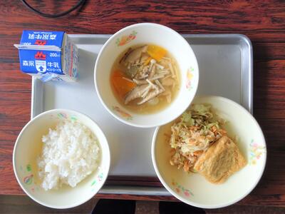 今日のメニューは、栗ごはん、つぼん汁、いわしのしょうが煮、キャベツのゆかりあえです。今月の「ふるさとくまさんデー」は、人吉・球磨地域。山江村の特産品である栗を使った「栗ごはん」と、お祭りやお祝いの時に昔から食べられている郷土料理「つぼん汁」を味わってください。