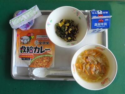 今日のメニューは、救給カレー、野菜スープ、ストックサラダ、ぶどうゼリー、「防災給食」です。玉名市に備蓄してある非常食「救給カレー」を試食しました。試食を通して、防災について考えてみましょう。