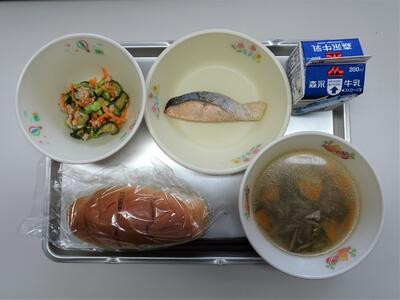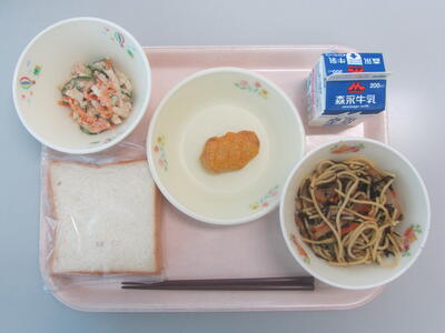 今日のメニューは、食パン、ひじきのスパゲティ、大豆ナゲット、だいこんサラダです。スパゲティに使われている「ひじき」には骨を強くするカルシウムやお腹の調子を整えてくれる食物繊維が多く含まれています。
