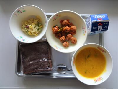 今日のメニューは、ココアパン、かぼちゃのポタージュ、ミートボールのケチャップあえ、れんコーンサラダです。今日のれんコーンサラダには少しだけカレー粉が使われています。カレー粉は数十種類のスパイスを焙煎してから粉末状にし、配合したもので、イギリスから世界に広がりました。日本には明治頃に伝わったそうです。