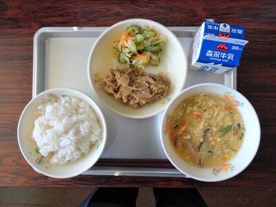 今日のメニューは、麦ごはん、スーミータン、ピリ辛炒め、キャベツのレモン酢あえです。スーミータンは中国のコーンスープです。漢字で書くと「粟米湯」と書き、「粟米=とうもろこし」「湯=スープ」という意味です。とうもろこしの甘みと食物繊維がたっぷり摂れる体に優しいスープです。