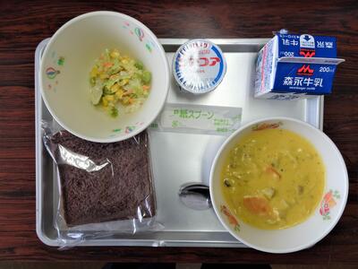 今日のメニューは、ココアパン、秋の香りシチュー、コーンと枝豆のサラダ、ヨーグルトです。今日のシチューには、これからが旬の里芋や栗が入っています。秋の味覚を味わってください。