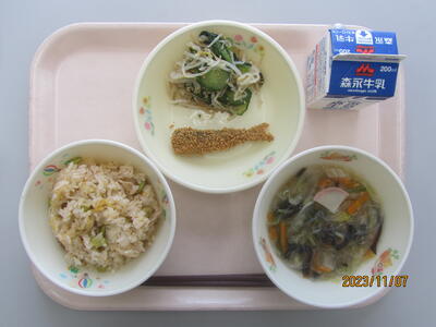 今日のメニューは、キムたくごはん、白菜と春雨のスープ、いわしのカリカリ揚げ、じゃこサラダです。今日はキムチとたくあんが入った、その名も「キムたくごはん」。キムチの辛さとたくあんの食感が食欲をそそる、人気のメニューです。美味しくいただきましょう。