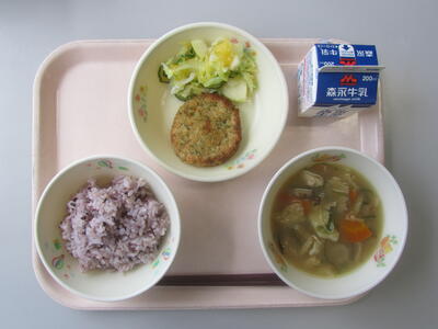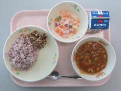 今日のメニューは、雑穀ごはん、畑の肉カレー、いりこの酢炊き、ヨーグルト和えです。「畑の肉カレー」には、畑の肉とも呼ばれる「大豆」が入っています。「大豆」はたんぱく質や脂質をたくさん含む栄養価が高い食材で、日本では弥生時代から栽培されていたそうですよ。