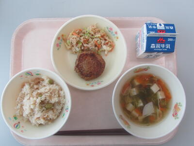 今日のメニューは、麦ごはん、ハヤシシチュー、大豆ナゲット、フレンチサラダです。「畑の肉」とも呼ばれる大豆は、たんぱく質や脂質を含む栄養価の高い食材です。日本では昔からいろんな食品や調味料に加工して食べられています。最近では大豆ミートなる代替食品も増えていますね。今日は大豆を使ったナゲットです。