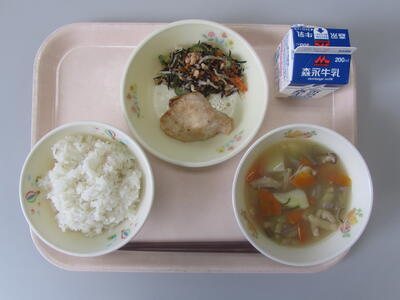 今日のメニューは、麦ごはん、根菜汁、ホキのカリカリ揚げ、もやしとひじきの和え物です。根菜は、土の中で育つ野菜のことで、秋から冬にかけてが旬のようです。今日の根菜汁は、ごぼう、大根、にんじんが入っています。