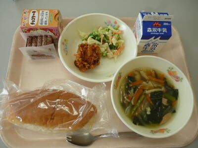 今日のメニューは、ミルクパン、コンソメスープ、鶏の唐揚げ、花野菜サラダ、セレクトデザートです。今日は子どもたちが楽しみにしていたクリスマスメニュー、唐揚げやケーキが付いています。美味しくいただきましょう。