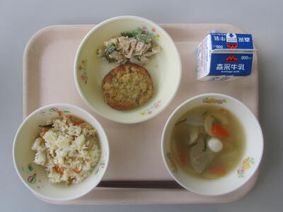 今日のメニューは、わかめごはん、チンゲン菜とコーンのスープ、鶏肉のマスタード焼き、甘夏サラダです。今日は「お誕生日献立」です。1月生まれの皆さん、お誕生日おめでとうございます。今月も楽しい給食の時間を過ごしながら、1月生まれの人をお祝いしましょう。