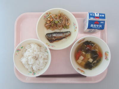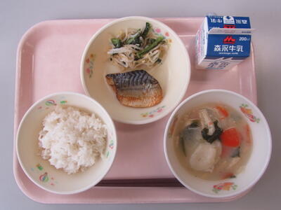 今日のメニューは、麦ごはん、栄養すいとん、さばの塩焼き、たくあん和えです。1月24日から1月30日までは全国学校給食週間です。日本の学校給食は、明治22年山形県の学校で貧しくてお弁当を準備できない子どもたちに食事を出したのが始まりといわれています。今日も美味しくいただきましょう。