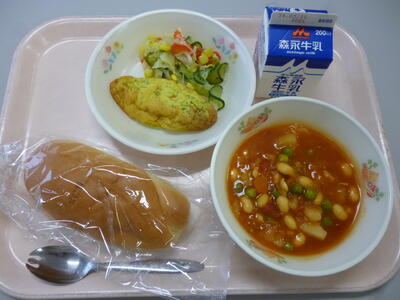 今日のメニューは、ミルクパン、チキンビーンズ ほうれん草オムレツ イタリアンサラダです。チキンビーンズは、アメリカの家庭料理「ポークビーンズ」から派生した料理です。豚肉の代わりに鶏肉を使い、豆や野菜などをトマトソースで煮込んでいます。今日も美味しくいただきましょう。
