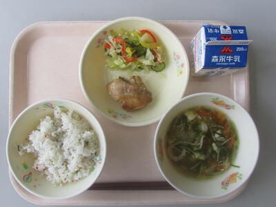 今日のメニューは、五色の花結びごはん、あおさ汁、鶏肉の香り焼き、カラフルサラダ、お祝いケーキです。今日は小学校卒業のお祝い献立、これまでの給食を振り返りながら、楽しい時間にしてください。ちなみに、八嘉小6年生が選んだ給食ランキング第1位は、男女ともに「あげぱん」でした。