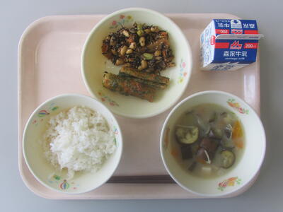 今日のメニューは、麦ごはん、なすのみそ汁、ちくわの磯辺揚げ、大豆の磯煮です。今月のみそ汁、7月の野菜は「なす」です。熊本県は全国でも有数のなすの生産地で、玉名でもたくさん生産されています。今が旬のなすを美味しくいただきましょう。