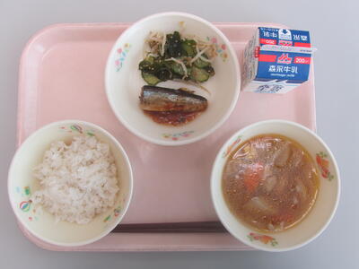 今日のメニューは、麦ごはん、芋の子汁、さんまのおかか煮、わかめの酢のものです。今月の「全国味の旅」は岩手県。「芋の子汁」は秋に旬を迎えるさといもを、にんじんや大根、ごぼう、きのこ、こんにゃく、豆腐、鶏肉等と煮込んだ岩手県の郷土料理です。旬のさといもを美味しくいただきましょう。