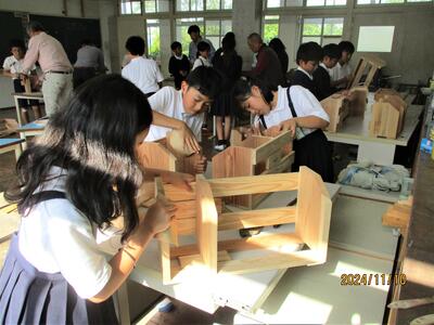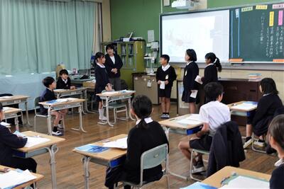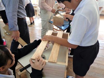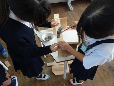 5年生では、環境学習の一環として、県の林務課の職員を講師に、森林教室と木工体験教室を開催しました。前半の森林教室では、熊本県の森林や森林の持つ機能などクイズ形式で学習しました。後半の木工教室では、県産のスギ材を使った本立てづくりに挑戦。友達と楽しそうに金槌を打つ子供達の姿が見られました。木材の手触りや香りを体感できたようです。