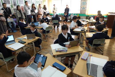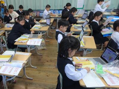 「10のまとまりがいくつと端数がいくつ」という数の見方を使いながら、大きな数の数え方を考える1年生。一人一人がタブレットや数図ブロックを上手に使って、考えを深めています。