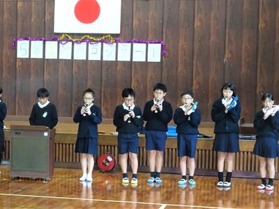 11月20日(水)、玉名市民会館の大ホールで玉名市小学校音楽会が開催されます。八嘉小からは3年生と4年生38人が参加予定です。今日は全校児童の前で、本番で合唱する2曲『にじ』『未来が生まれてる』を披露しました。少し照れたような表情の子供たち。本番では、38人声と心を合わせて、合唱を楽しみましょう。
