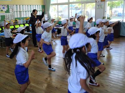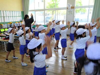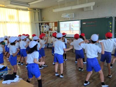 5月に入り、学校では運動会へ向けての取組がいよいよ始まります。1、2年生でも表現(ダンス)の練習が始まりました。今日は、教室で、動画を見ながら身振り手振り、体を動かしました。どちらの教室からも、楽しそうな歓声が聞こえてきます。本番の演技が楽しみす。