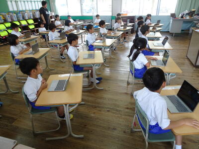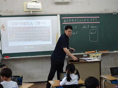 1年生もいよいよ「タブレット」デビューしました。ICT支援員さんから、タブレットの起動、ログインの仕方等の基本操作を教えてもらいました。ログインではタッチ画面をスワイプし、一人一人パスワードの入力まで何とかできました。これから、学習の中でいっぱい使っていきましょう。