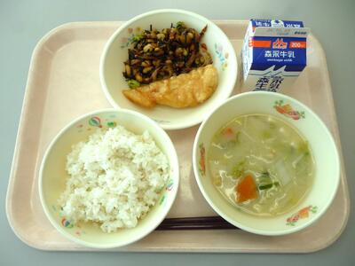 今日のメニューは、麦ごはん、牛乳、ワンタンスープ、豚キムチ、ごまきゅうりです。 身近な食材である豚肉には、筋肉を作るための良質なタンパク質が沢山含まれています。また、ビタミンB1も多く含まれており、糖質の代謝を助け、疲労回復におすすめの栄養素です。そんな豚肉を、今日は豚キムチでいただきましょう。