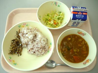 今日のメニューは、雑穀ごはん、牛乳、冬野菜のカレー、いりこの酢炊き、フレンチサラダです。冬野菜とは、寒い季節に旬を迎える野菜のことで、大根や白菜、ほうれん草、カブ、ブロッコリーなどが代表的です。これらの野菜にはビタミンCやβカロテンが豊富に含まれており、免疫力を高める働きがあります。また、冬の寒さに耐えるために糖分を蓄えるので、甘みが強く、より美味しくなるのも特徴です。今日は、そんな栄養たっぷりの冬野菜がたくさん入ったカレーを、温かく美味しくいただきましょう。