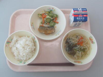 今日のメニューは、麦ごはん、牛乳、魚そうめん汁、さんまのゆず味噌煮、白菜の甘酢あえです。だし(出汁)は、肉・野菜・乾物などから抽出される旨味成分を含んだ液体で、味噌汁や煮物をはじめ、和食のさまざまな料理に欠かせない存在です。中でも、昆布やかつお節から取るだしは、料理全体の味をより引き立ててくれます。今日の魚そうめん汁には、「いりこ」と「かつお」から取っただしが使われています。旨味たっぷりのやさしい味わいを、美味しくいただきましょう。