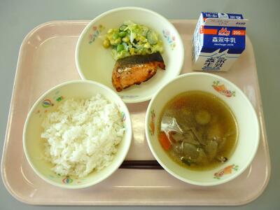 本日のメニューは、麦ごはん、牛乳、根菜汁、鮭のハーブ焼き、枝豆とコーンのサラダです。人気メニューのひとつ「鮭のハーブ焼き」は、朝から一枚一枚丁寧にバジルドレッシングをかけ、給食センターの大きなオーブンでふっくらと焼き上げました。ハーブのさわやかな香りが広がり、食欲をそそる一品です。根菜汁は、旬の根菜をたっぷり使い、具だくさんで栄養満点。鮭のハーブ焼きと一緒に美味しくいただきましょう。