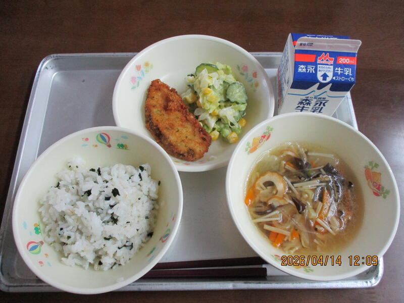 新タマネギと白味噌の甘さが抜群においしい味噌汁。大豆の歯ごたえが楽しめるかわりやき。たけのこたっぷりのきんぴらと季節をたくさん感じる給食でした。1年生は先週に続き、2回目の給食でした。少し慣れたかな。
