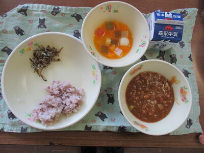 やわらかいひき肉を使ったカレー。ついついよく噛まずに食べてしまいそうです。そこで、今日はカミカミメニューの「いりこの酢炊き」が組み合わせてありました。よく噛んで食べましょう。