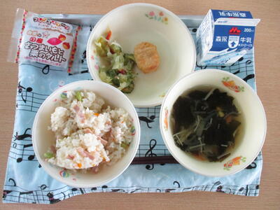 「わかめスープ」「チキンナゲット」「イタリアンサラダ」「ハムピラフ」「芋と栗のタルト」でした。