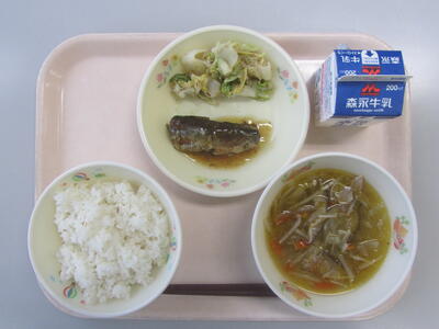今日のメニューは、麦ごはん、沢煮椀(さわにわん)、いわしのしょうが煮、白菜のごま酢和えです。沢煮椀の「沢」には「たくさん」という意味があります。千切りにしたたくさんの野菜やお肉を使って作った汁物です。美味しくいただきましょう。
