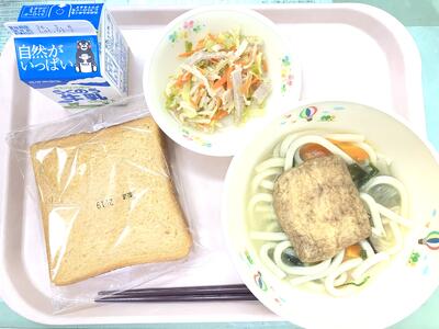 問題です。料理に「きつね」と名前が付いているときに使われる食品は次のうちどれでしょう?①ねぎ②きつねの肉③油揚げ、さて何番でしょう?給食を見ればわかりますよね。正解は、②番!ではなくて、③番の油揚げです。きつねは神様の使いとして、稲荷神社で油揚げをおそなえされ、昔話でも油揚げをとる話が多かったので、油揚げをきつねとよぶようになりました。油揚げは、豆腐をうすく切って油で揚げたものです。つまり大豆が姿をかえた食品です。今日のきつねは、大塚さんがじっくり炊き上げてくださいました