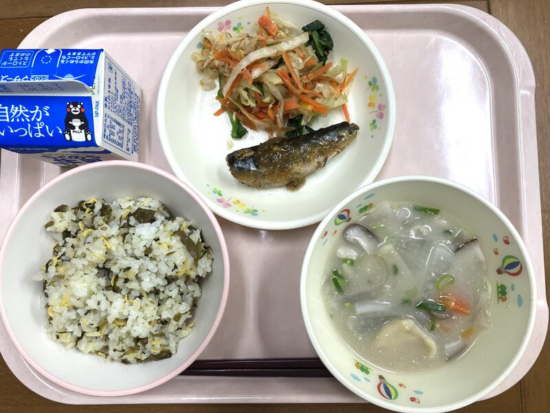 よくかんで食べていますか?しっかりかむことを意識して食べてもらうために、スープに茎わかめを入れています。給食にもよく登場するわかめは、葉っぱの部分ですが、茎わかめは、海底から生えている茎の部分です。海の中でゆらゆらとゆれても、しっかり葉っぱを支えるために、かたくなっているのですね。コリコリした食感を感じながら食べてくださいね。ちなみに、サラダのきくらげも、かみごたえがあるのでかんで食べてくださいね。新鮮な生のきくらげです