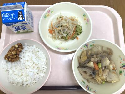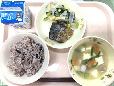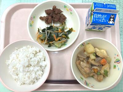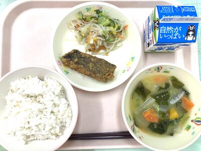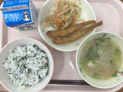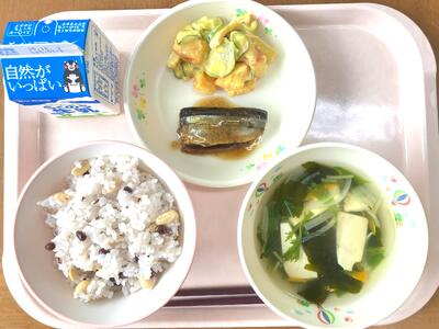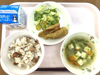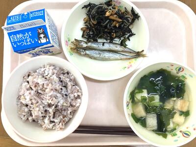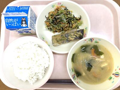 11月24日は、「和食の日」でした。これは、「いい日本食」という語呂合わせからできました。5年生の家庭科で「和食」は日本の伝統的な食事ということを学習しますね。和食は、自然を尊重し、季節の美しさを大事にする心や、栄養バランスもとれ、いろいろな行事ともかかわりが深い食事です。和食の献立は、主食となるごはんを中心に、しる物とおかずを組み合わせるのが基本です。今日は、南阿蘇のお米とさつまいもでごはんを炊きました。汁物は、和食の基本となるみそ汁です。おかずは、昔から食べられてきたいわしと旬のれんこんを使いました、。伝統的な日本の食事である和食を未来につなげていきたいですね。